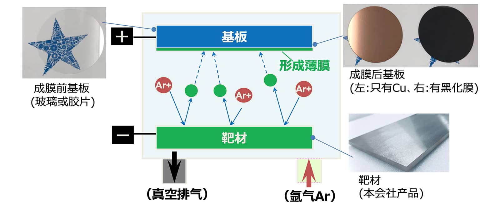 利用溅射法,以原子形式使金属和合金及金属氧化物等的物质附着到对象电子基板上, 形成薄膜的材料。