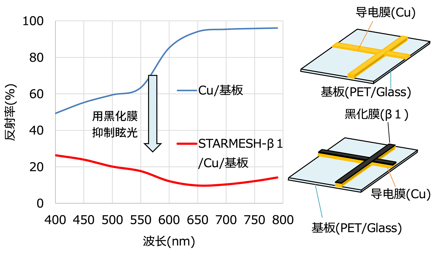 因此,金属网格电极正在取代ITO电极不断得到普及。主要用于金属网格电极的铜导电膜具有金属光泽,其反射眩光影响可视性,需要在金属导电膜上层叠黑化膜来抑制反射。